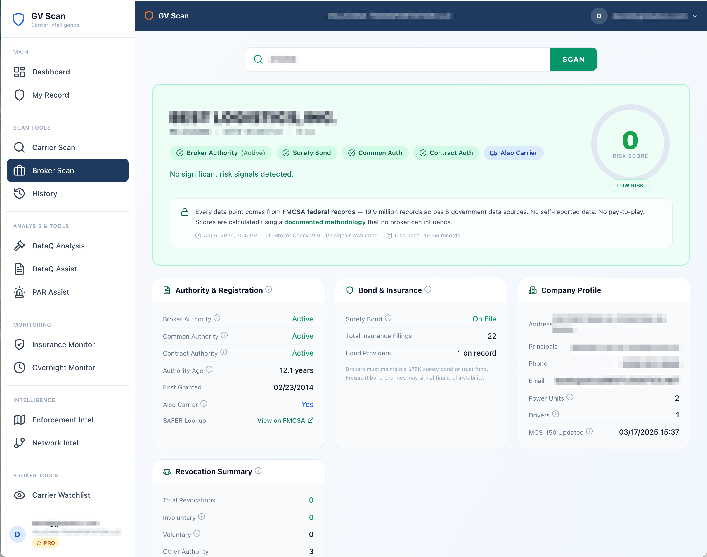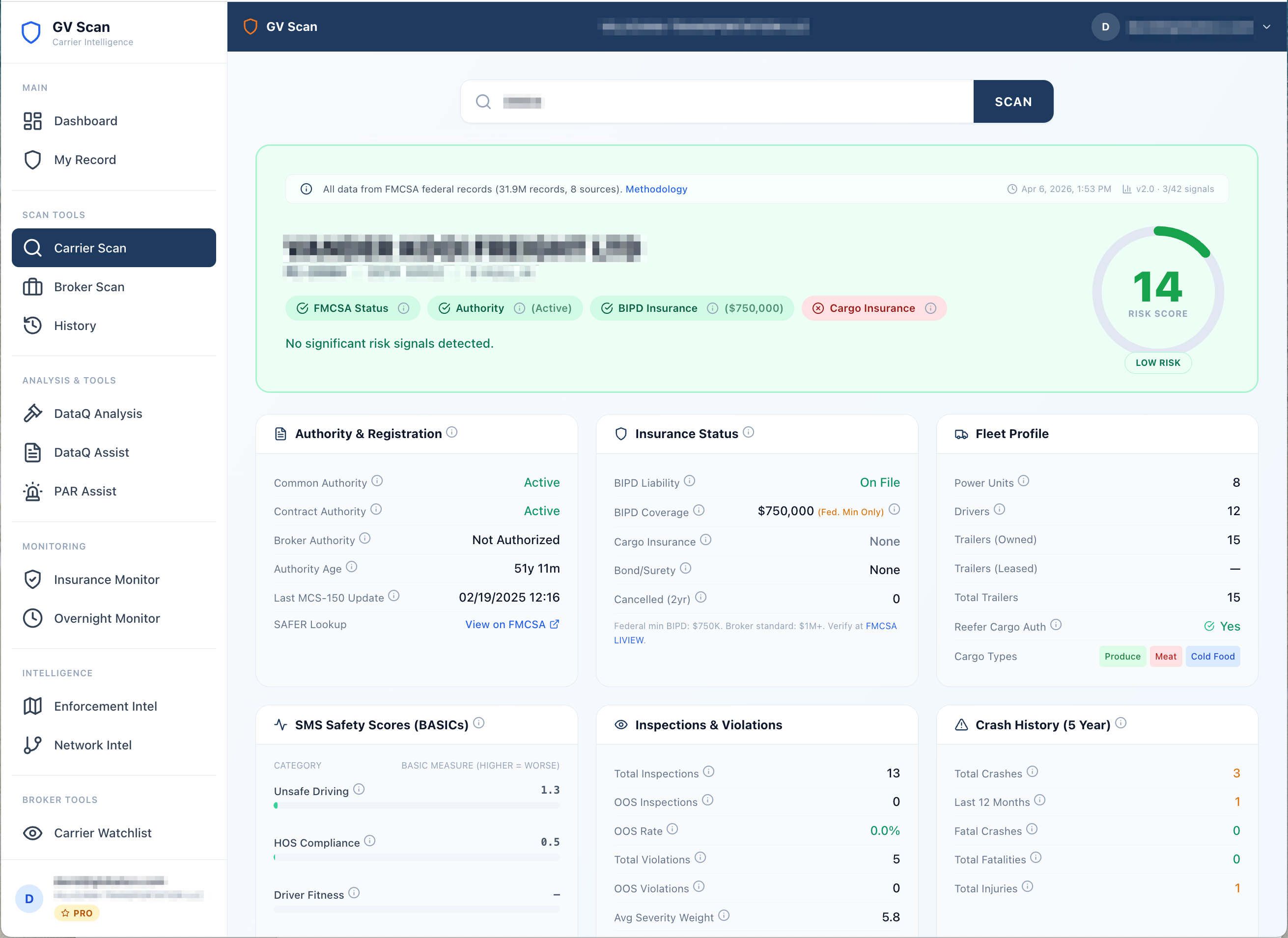 Enter a valid MC# or DOT#. See the full picture in seconds: authority status, insurance filings, SMS safety scores, crash history, violation patterns, and a peer-normalized risk score across 43 signals from 9 federal data sources.